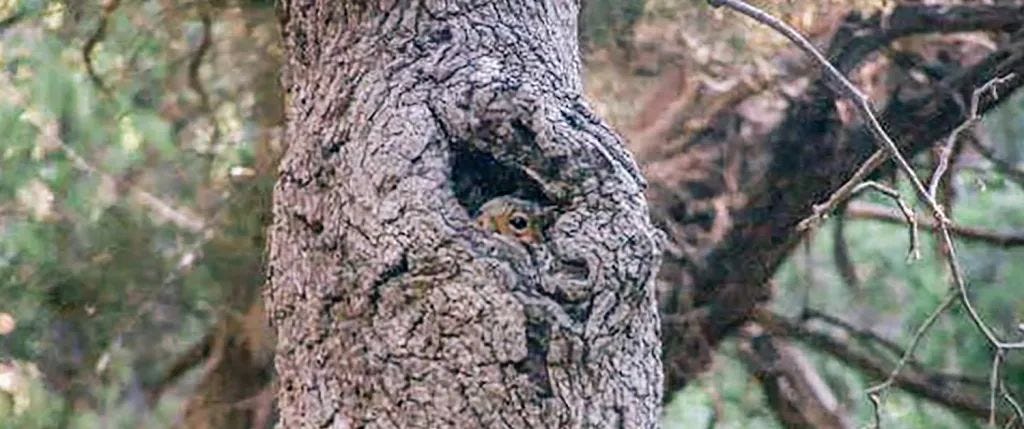 In the photograph, you can see an old trunk — rough bark, hollowed wood, a dark opening where decay has eaten into the heart of the tree.