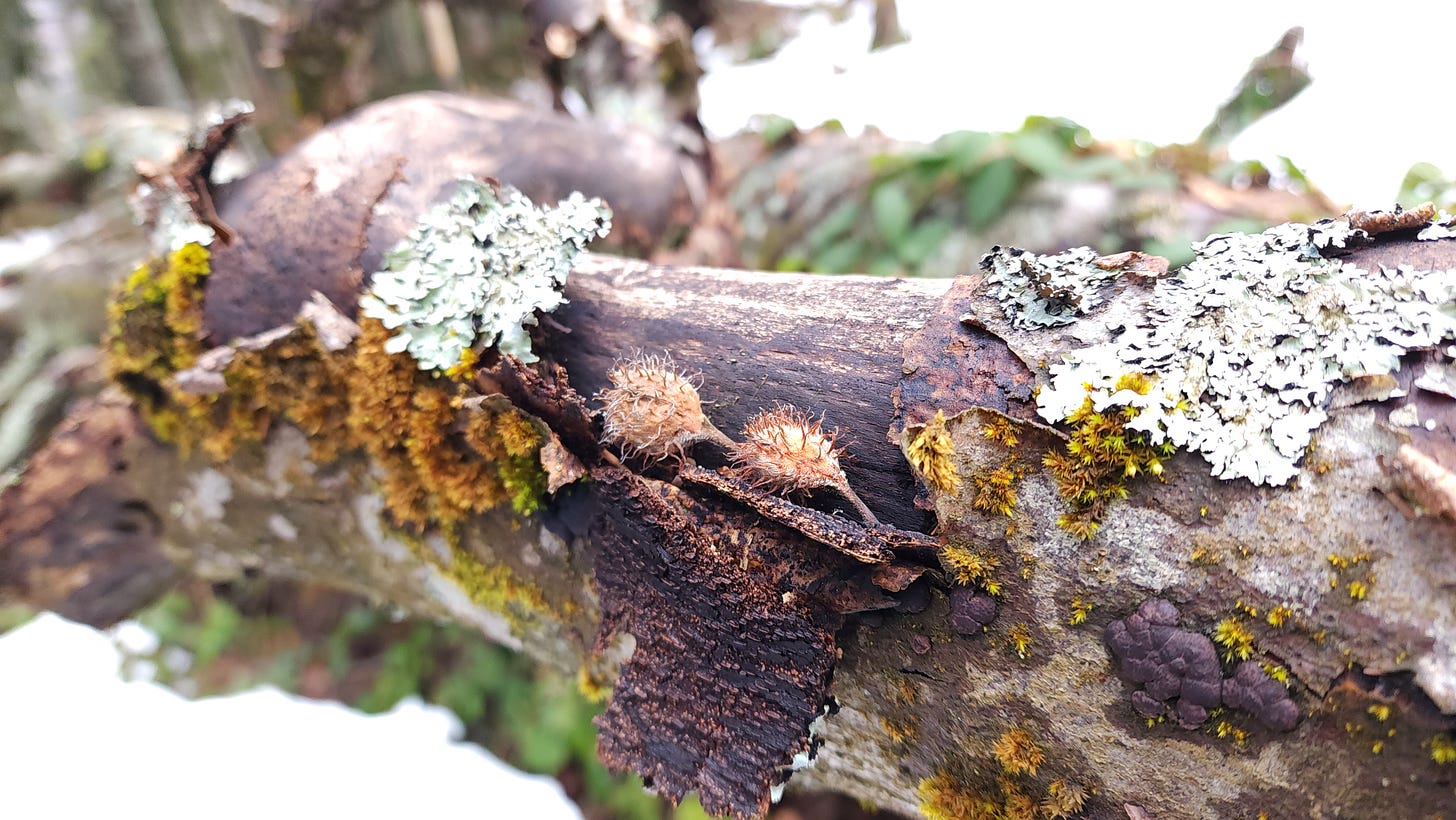 Once a tree begins to decline, insects move into the loosening bark. Beetles tunnel through the wood. Ants establish colonies inside the trunk. Fungi send pale threads through the heartwood, slowly softening the tree.