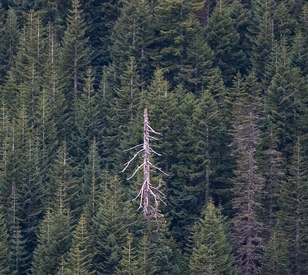 A snag is a dwelling place for birds and animals, a lookout for hawks, a nursery for insects, and eventually food for the forest floor. A single hollow trunk may support hundreds of small lives.